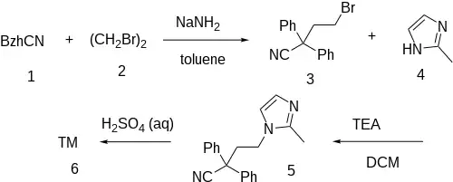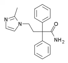 The alkylation of Diphenylacetonitrile [86-29-3] (1)[7] with 1,2-dibromoethane (2) gives 4-Bromo-2,2-Diphenylbutyronitrile [39186-58-8] (3). Alkylation with 2-Methylimidazole (4) gives 4-(2-Methyl-1H-imidazol-1-yl)-2,2-diphenylbutanenitrile [214777-43-2] (5). Partial hydrolysis of the nitrile to the amide completes the synthesis of Imidafenacin (6).