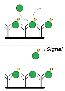In a competitive, homogeneous immunoassay, unlabelled analyte in a sample competes with labeled analyte to bind an antibody. The amount of labelled, unbound analyte is then measured. In theory, the more analyte in the sample, the more labelled analyte gets displaced and then measured; hence, the amount of labelled, unbound analyte is proportional to the amount of analyte in the sample.