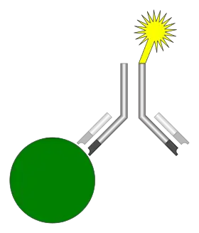 ![]() Illustration of the basic components of an immunoassay, which includes an analyte (green), an antibody (black), and a detectable label (yellow). | |
