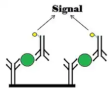 The analyte in the unknown sample is bound to the antibody site, then the labelled antibody is bound to the analyte. The amount of labelled antibody on the site is then measured. It will be directly proportional to the concentration of the analyte because the labelled antibody will not bind if the analyte is not present in the unknown sample. This type of immunoassay is also known as a sandwich assay as the analyte is "sandwiched" between two antibodies.