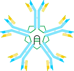 Immunoglobulin M (IgM) is one of several isotypes of antibody (also known as immunoglobulin) that are produced by vertebrates. IgM is the largest antibody, and it is the first antibody to appear in the response to initial exposure to an antigen.[1][2] In humans and other mammals that have been studied, plasmablasts residing in the spleen are the main source for specific IgM production.[3][4]