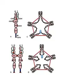 On the basis of its sedimentation velocity and appearance in electron micrographs, it was inferred that IgM usually occurs as a “pentamer”, i.e., a polymer composed of five “monomers” [(µL)2]5, and was originally depicted by the models in Figures 1C and 1D, with disulfide bonds between the Cµ3 domains and between the tail pieces.[11][12] Also shown is that pentameric IgM includes a third protein, the J chain. J chain (J for joining) was discovered as a covalently bonded component of polymeric IgA and IgM.[13][14] The J chain is a small (~137 amino acids), acidic protein. As shown, the J chain joins two µ chains via disulfide bonds involving cysteines in the tailpieces.[15]