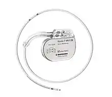 A single chamber ICD with its right ventricular lead connected into the header; note, starting from the end of the lead, the tip and adjacent first ring, used to sense the cardiac electrical activity and stimulate the right ventricle, the coil and the two rings for atrial sensing.
