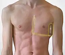 A patient who had an ICD fitted in 2016 following cardiac arrest described the ICD as being "half the size of your mobile phone and a little bit thicker, in my chest and has two wires attached to it ... screwed into the bottom of your heart. ... I opted to have it fitted under my pectoral muscle, so you can't see it but you can see the wires in my chest - if you wanted to. Some have them on top of the pectoral muscle, so you can see it."[16]