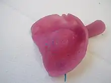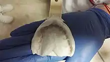 Agar is a material which provides high accuracy. Therefore, it is used in fixed prosthodontics (crowns, bridges) or when a dental model has to be duplicated by a dental technician. Agar is a true hydrophilic material, hence the teeth do not need to be dried before placing it into the mouth.[1] It is a reversible hydrocolloid which means that its physical state can be changed by altering its temperature which allows to reuse the material multiple times. The material comes in form of tubes or cartridges. A special hardware is required in the process of taking agar impressions, namely a water bath and rim lock trays with coiled edges allowing passage of cold water for cooling the material to set while in the mouth. The bath consists of three containers filled with water at different temperatures: the first is set at 100 °C to liquefy the agar, the second is used to lower down the temperature of the material for safe intra-oral use (usually set at 43–46 °C) and the third one is used for storage and is set at 63–66 °C. The storage container can maintain agar tubes and cartridges at temperature 63–66 °C for several days for convenient immediate use. The tray is connected to a hose, material is loaded onto the tray and placed in the mouth over the preparation – an adequate thickness of the material is required, otherwise distortion may occur upon removal from the mouth. The other end of the hose is connected to a cold water source. The hydrocolloid is then cooled down through the tray wall which results in setting of the material. The models should be poured as soon as possible to avoid changes in dimensional stability.[1]