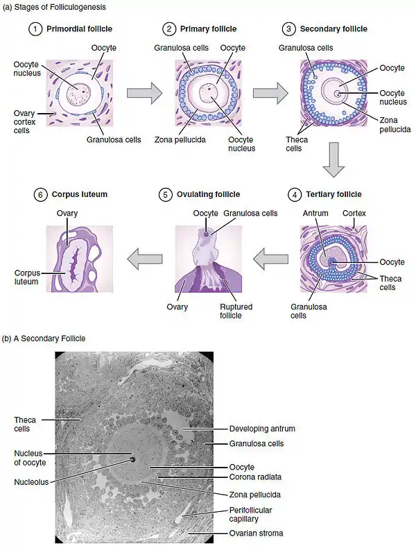 Primordial follicles containing the primary oocyte, arrested at prophase of meiosis I,[8] develop into primary follicle containing cuboidal granulosa cells. A secondary follicle is formed with a few granulosa cell layers, as well as a theca layer. Finally before ovulation, a tertiary follicle is formed containing a follicular-fluid filled antrum.[6] Of these small antral follicles, 1 will become dominant and ovulate (in monoovulatory species). During ovulation, the primary oocyte will resume meiosis in response to signals, arresting in metaphase meiosis II, ready for fertilization.[3] The dominant follicle contains the mature oocyte. Follicular development is directly under gonadotropins control, LH and FSH. These use cAMP as an intracellular second messenger, with growth factors and cytokines also influencing their development in vivo.[7]