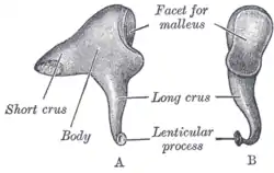 The incus is the second of the ossicles, three bones in the middle ear which act to transmit sound. It is shaped like an anvil, and has a long and short crus extending from the body, which articulates with the malleus.[2]: 862 The short crus attaches to the posterior ligament of the incus. The long crus articulates with the stirrup at the lenticular process.