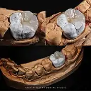 An onlay is a method of tooth restoration, which covers, protects or reinforces one or more cusps. Onlays are methods for restoring teeth in an indirect way. Onlays are often used when teeth present extensive destruction due to caries or to trauma.