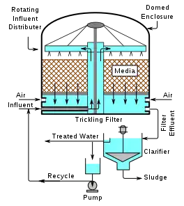 A trickling filter consists of a bed of rocks, gravel, slag, peat moss, or plastic media over which wastewater flows downward and contacts a layer (or film) of microbial slime covering the bed media. Aerobic conditions are maintained by forced air flowing through the bed or by natural convection of air. The process involves adsorption of organic compounds in the wastewater by the microbial slime layer, diffusion of air into the slime layer to provide the oxygen required for the biochemical oxidation of the organic compounds. The end products include carbon dioxide gas, water and other products of the oxidation. As the slime layer thickens, it becomes difficult for the air to penetrate the layer and an inner anaerobic layer is formed.
