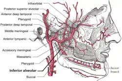 The inferior alveolar artery (inferior dental artery) is an artery of the face. It is a branch of the first portion of the maxillary artery. It descends as part of a neurovascular bundle with the inferior alveolar nerve and vein to the mandibular foramen where it enters and passes anterior-ward inside the mandible, suplying the body of mandible and the dental pulp of lower molar and premolar teeth. Its mental branch exits the mandibula anteriorly through the mental foramen to supply adjacent lip and skin.[1]