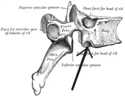 In the adjacent picture, the arrow points to an inferior costal facet. The facets are named for their location on the vertebral body, not the rib. The inferior costal facet is located on the inferior aspect of the vertebral body, but has a superior location on the rib. Similarly, the superior costal facet is superior on the vertebral body but is inferior on the rib.