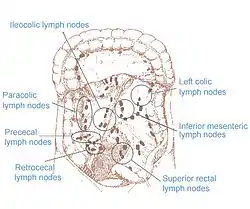 They drain into the superior mesenteric lymph nodes and ultimately to the preaortic lymph nodes.[1] Lymph nodes surrounding the inferior mesenteric artery drain directly into the preaortic nodes.[1]