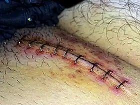 Surgical correction of inguinal hernias is called a hernia repair. It is not recommended in minimally symptomatic hernias, for which watchful waiting is advised, due to the risk of post herniorraphy pain syndrome. Surgery is commonly performed as outpatient surgery. There are various surgical strategies which may be considered in the planning of inguinal hernia repair. These include the consideration of mesh use (e.g. synthetic or biologic), open repair, use of laparoscopy, type of anesthesia (general or local), appropriateness of bilateral repair, etc. Mesh or non mesh repairs have both benefits in different areas, but mesh repairs may reduce the rate of hernia reappearance, visceral or neurovascular injuries, length of hospital stay and time to return to activities of daily living.[28] Laparoscopy is most commonly used for non-emergency cases; however, a minimally invasive open repair may have a lower incidence of post-operative nausea and mesh associated pain. During surgery conducted under local anaesthesia, the patient will be asked to cough and strain during the procedure to help in demonstrating that the repair is without tension and sound.[29]