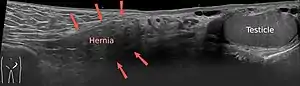 A physician may diagnose an inguinal hernia, as well as the type, from medical history and physical examination.[20] For confirmation or in uncertain cases, medical ultrasonography is the first choice of imaging, because it can both detect the hernia and evaluate its changes with for example pressure, standing and Valsalva maneuver.[21]