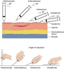 Intradermal injections, abbreviated as ID, consist of a substance delivered into the dermis, the layer of skin above the subcutaneous fat layer, but below the epidermis or top layer. An intradermal injection is administered with the needle placed almost flat against the skin, at a 5 to 15 degree angle.[15] Absorption from an intradermal injection takes longer than when the injection is given intravenously, intramuscularly, or subcutaneously. For this reason, few medications are administered intradermally. Intradermal injections are most commonly used for sensitivity tests, including tuberculin skin tests and allergy tests, as well as sensitivity tests to medications a person has never had before. The reactions caused by tests which use intradermal injection are more easily seen due to the location of the injection, and when positive will present as a red or swollen area. Common sites of intradermal injections include the forearm and lower back.[15]