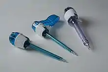 Access instrument. Used to create an opening into a space without opening the abdominal cavity. A camera then inserted through one to view the inside of the space while instruments are inserted through the others to manipulate the organs. | |
