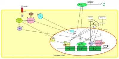 NeuroD1, also known as β2, regulates insulin exocytosis in pancreatic β cells by directly inducing the expression of genes involved in exocytosis.[36] It is localized in the cytosol, but in response to high glucose it becomes glycosylated by OGT and/or phosphorylated by ERK, which causes translocation to the nucleus. In the nucleus β2 heterodimerizes with E47, binds to the E1 element of the insulin promoter and recruits co-activator p300 which acetylates β2. It is able to interact with other transcription factors as well in activation of the insulin gene.[36]