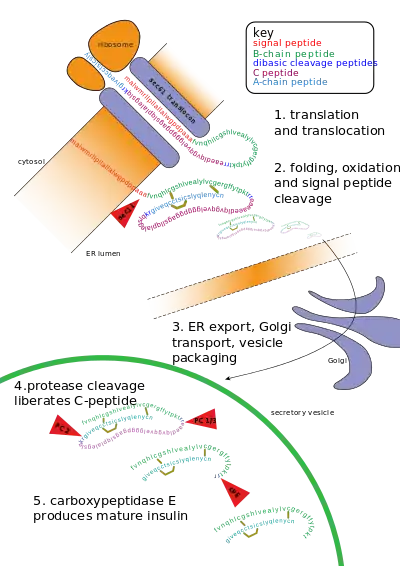 Insulin is synthesized as an inactive precursor molecule, a 110 amino acid-long protein called "preproinsulin". Preproinsulin is translated directly into the rough endoplasmic reticulum (RER), where its signal peptide is removed by signal peptidase to form "proinsulin".[25] As the proinsulin folds, opposite ends of the protein, called the "A-chain" and the "B-chain", are fused together with three disulfide bonds.[25] Folded proinsulin then transits through the Golgi apparatus and is packaged into specialized secretory vesicles.[25] In the granule, proinsulin is cleaved by proprotein convertase 1/3 and proprotein convertase 2, removing the middle part of the protein, called the "C-peptide".[25] Finally, carboxypeptidase E removes two pairs of amino acids from the protein's ends, resulting in active insulin – the insulin A- and B- chains, now connected with two disulfide bonds.[25]