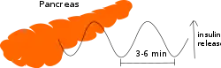 Even during digestion, in general, one or two hours following a meal, insulin release from the pancreas is not continuous, but oscillates with a period of 3–6 minutes, changing from generating a blood insulin concentration more than about 800 p mol/l to less than 100 pmol/L (in rats).[60] This is thought to avoid downregulation of insulin receptors in target cells, and to assist the liver in extracting insulin from the blood.[60] This oscillation is important to consider when administering insulin-stimulating medication, since it is the oscillating blood concentration of insulin release, which should, ideally, be achieved, not a constant high concentration.[60] This may be achieved by delivering insulin rhythmically to the portal vein, by light activated delivery, or by islet cell transplantation to the liver.[60][61][62]