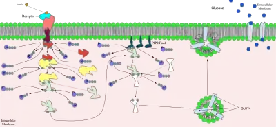 - Stimulates the uptake of glucose – Insulin decreases blood glucose concentration by inducing intake of glucose by the cells. This is possible because Insulin causes the insertion of the GLUT4 transporter in the cell membranes of muscle and fat tissues which allows glucose to enter the cell.[65]