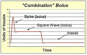 A combination bolus/multiwave bolus is the combination of a standard bolus spike with an extended bolus square wave. This shape provides a large dose of insulin up front, and then also extends the tail of the insulin action. The combination bolus is appropriate for high carb high fat meals such as pizza, pasta with heavy cream sauce, and chocolate cake.