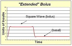 An extended bolus is a slow infusion of insulin spread out over time. By pumping with a "square wave" shape, the bolus avoids a high initial dose of insulin that may enter the blood and cause low blood sugar before digestion can facilitate sugar entering the blood. The extended bolus also extends the action of insulin well beyond that of the insulin alone. The extended bolus is appropriate when covering high fat high protein meals such as steak, which will be raising blood sugar for many hours past the onset of the bolus. The extended bolus is also useful for those with slow digestion (such as with gastroparesis or coeliac disease).