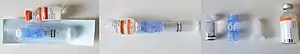 ![]() Paradigm insulin pump 530g, showing an infusion set loaded into spring-loaded insertion device called serter. A reservoir is attached to the infusion set (shown here removed from the pump). |