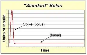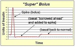 A super bolus is a method of increasing the spike of the standard bolus. Since the action of the bolus insulin in the blood stream will extend for several hours, the basal insulin could be stopped or reduced during this time. This facilitates the "borrowing" of the basal insulin and including it into the bolus spike to deliver the same total insulin with faster action than can be achieved with spike and basal rate together. The super bolus is useful for certain foods (like sugary breakfast cereals) which cause a large post-prandial peak of blood sugar. It attacks the blood sugar peak with the fastest delivery of insulin that can be practically achieved by pumping.