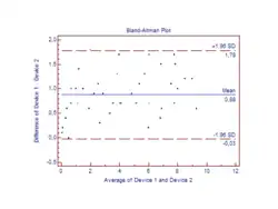 Bland and Altman[15] have expanded on this idea by graphing the difference of each point, the mean difference, and the limits of agreement on the vertical against the average of the two ratings on the horizontal. The resulting Bland–Altman plot demonstrates not only the overall degree of agreement, but also whether the agreement is related to the underlying value of the item. For instance, two raters might agree closely in estimating the size of small items, but disagree about larger items.