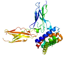 IL-29 is, with the rest of IFN-λ, structurally related to the IL-10 family, but its primary amino acid sequence (and also function) is more similar to type I interferons.[3] It binds to a heterodimeric receptor composed of one subunit IFNL1R specific for IFN-λ and a second subunit IL10RB shared among the IL-10 family cytokines.[3]