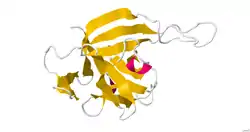 IL-33 is a member of the IL-1 superfamily of cytokines, a determination based in part on the molecules β-trefoil structure, a conserved structure type described in other IL-1 cytokines, including IL-1α, IL-1β, IL-1Ra and IL-18. In this structure, the 12 β-strands of the β-trefoil are arranged in three pseudorepeats of four β-strand units, of which the first and last β-strands are antiparallel staves in a six-stranded β-barrel, while the second and third β-strands of each repeat form a β-hairpin sitting atop the β-barrel. IL-33 is a ligand that binds to a high-affinity receptor family member ST2. The complex of these two molecules with IL-1RAcP indicates a ternary complex formation. The binding area appears to be a mix of polar and non-polar regions that create a specific binding between ligand and receptor. The interface between the molecules has been shown to be extensive. Structural data on the IL-33 molecule was determined by solution NMR and small angle X-ray scattering.[8]