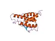 IL-4 has a compact, globular fold (similar to other cytokines), stabilised by 3 disulphide bonds.[9] One half of the structure is dominated by a 4 alpha-helix bundle with a left-handed twist.[10] The helices are anti-parallel, with 2 overhand connections, which fall into a 2-stranded anti-parallel beta-sheet.[10]