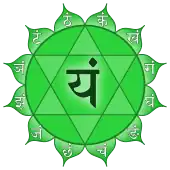 The cleavage area is special in Ayurvedic and Yogic philosophy as the fourth chakra' or anahata chakra (अनाहत meaning "unstruck" in Sanskrit, the heart chakra) supposedly lies at the level of the depression in the sternum.[58][57] The astral anahata chakra supposedly lies between the breasts, just inside the front of the chest level with the nipples.[59][60][61] According to Yogashikha Upanishad, the sacred text on yoga, 101 nadis (energy channels) connect the anahata chakra with the rest of the body, including ida, pingala and shushumna, the three major nadis.[62]