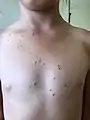 Intermammary cleft can get attacked by plaque type psoriasis, which can in turn can cause erythematosus.[47] Prurigo pigmentosa is a rare skin condition of unknown cause that affects depressed places on chest and back like the intermammary area. It is characterized by the sudden onset of erythematous papules that leave a reticulated hyperpigmentation when they heal.[48][49] Confluent and reticulated papillomatosis, characterized by asymptomatic, small, red to brown, slightly verrucous papules occurs on upper torso, the cleavage area and back.[50] Granular Parakeratosis, though mostly an ailment of the armpit area, is also found on the cleavage.[51]