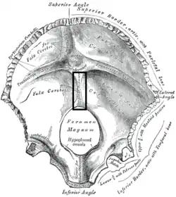 Base of the skull. Upper surface. (Internal occipital crest visible below foramen magnum.)