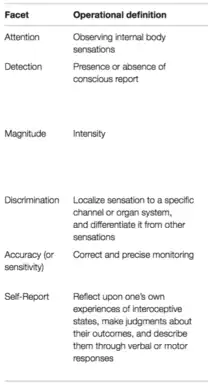 Although interoception as a term has more recently gained increased popularity, different aspects of it have been studied since the 1950s. These include the features of attention, detection, magnitude, discrimination, accuracy, sensibility, and self-reporting.[1][31] Despite not using the word interoception specifically, many publications in the physiology and medical fields have focused on understanding interoceptive information processing in different organ systems. Attention describes the ability to observe sensations within the body, it can be directed voluntarily in a "top down" manner or it can be attracted involuntarily in a "bottom up" manner. Detection reflects the presence or absence of a conscious report of interoceptive stimuli, like a heartbeat or growling stomach. Magnitude is the intensity of the stimulus, or how strongly the stimuli is felt. Discrimination describes the ability to localize interoceptive stimuli in the body to specific organs and differentiate them from other bodily stimuli that also occur, like distinguishing between a heart which is beating hard from an upset stomach. Accuracy (or sensitivity) refers to how precisely and correctly an individual can monitor specific interoceptive processes. Self-reporting is itself multifaceted. It describes the ability to reflect on interoceptive experiences occurring over different periods of time, make judgments about them, and describe them. Brain-body interactions can also be studied using neuroimaging techniques to map functional interactions between brain and peripheral signals. Although all of these components of interoception have been studied since the mid-twentieth century, they have not been brought together under the umbrella term "interoception" until more recently.[1] The term "interoceptive awareness" is also frequently used to encompass any (or all) of the different interoception features that are accessible to conscious self-report. This multifaceted approach offers a unified way of looking at interoceptive functioning and its different features, it clarifies the definition of interoception itself, and it informs structured ways of assessing interoceptive experiences in an individual.