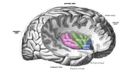 The anterior insular cortex (AIC) is involved in the representation of "cognitive feelings" which arise from the moment-to-moment integration of homeostatic information from the body. These feelings engender self-awareness by creating a sentient being (someone able to feel and perceive) aware of bodily and cognitive processing.[46] Essentially all subjective bodily feelings are associated with activation in the anterior insula: interoceptive feelings come to awareness in the anterior insula. PET studies of cool feelings revealed that activiation that correlated with the subjective ratings of cool temperatures on the hand appeared first in the mid-insula, and then it was strongest in the right anterior insula and orbitofrontal cortex. Feelings from the body of heat pain or C-tactile affective touch also produce activation in the posterior, mid-, and anterior insula, and the strongest activation associated with these subjective feelings is in the anterior insula. One study of heat pain explicitly showed that activation in the dorsal posterior insula correlated with objective painful heat intensity, whereas activation in the right anterior insula correlated with subjective pain intensity ratings. Similarly, subjective ratings of flavors and tastes correlates strongly with activation in the left anterior insula. The available evidence supports the interpretation that feelings from the body is engendered in the anterior insula.[53][54][55]