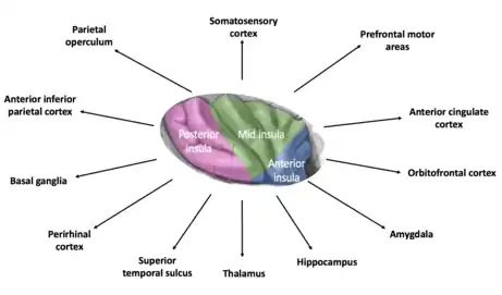 The insula is critically involved in the processing, integration, and cortical representation of visceral and interoceptive information. Lamina I spinothalamic and vagal afferents project via the brainstem and thalamus to the posterior and mid dorsal insula respectively. From there, information travels to the posterior and mid-insula, which combines visceral and somatosensory information.[34] The insula is also activated during a variety of exteroceptive and affective tasks. The insula is considered to be a "hub" region because it has an extremely high number of connections with other brain areas, suggesting it may be important for an integration of lower-level physiological information and salience.[52]
