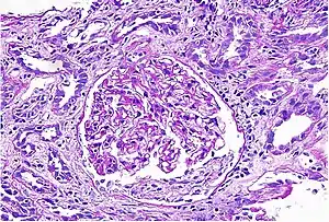 Interstitial nephritis, also known as tubulointerstitial nephritis, is inflammation of the area of the kidney known as the renal interstitium, which consists of a collection of cells, extracellular matrix, and fluid surrounding the renal tubules. It is also known as intestinal nephritis because the clinical picture may include mesenteric lymphadenitis in some cases of acute pyelonephritis (mostly due to use of NSAIDs). More specifically, in case of recurrent urinary tract infection, secondary infection can spread to adjacent intestine.[1] In addition to providing a scaffolding support for the tubular architecture, the interstitium has been shown to participate in the fluid and electrolyte exchange as well as endocrine functions of the kidney.[1]