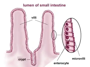 The brush border on the apical surface of the epithelial cells is covered with glycocalyx, which is composed of oligosaccharides attached to membrane glycoproteins and glycolipids.[5]