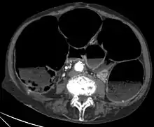 Intestinal pseudo-obstruction (IPO) is a clinical syndrome caused by severe impairment in the ability of the intestines to push food through. It is characterized by the signs and symptoms of intestinal obstruction without any lesion in the intestinal lumen.[1] Clinical features mimic those seen with mechanical intestinal obstructions and can include abdominal pain, nausea, abdominal distension, vomiting, dysphagia and constipation[2][3] depending upon the part of the gastrointestinal tract involved.