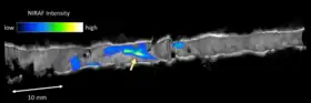 ![]() Example of intracoronary fluorescence in combination with intracoronary optical coherence tomography to better identify molecular processed of atherosclerosis.[1] |