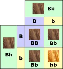 Now imagine that this woman grows up and has children with a brown-haired man who also has a Bb genotype. Her eggs will be a mixture of two types, one sort containing the B allele, and one sort the b allele. Similarly, her partner will produce a mix of two types of sperm containing one or the other of these two alleles. When the transmitted genes are joined up in their offspring, these children have a chance of getting either brown or red hair, since they could get a genotype of BB = brown hair, Bb = brown hair or bb = red hair. In this generation, there is, therefore, a chance of the recessive allele showing itself in the phenotype of the children—some of them may have red hair like their grandfather.[2]