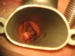 | Laryngoscopic view of the vocal process. An intubation granuloma is visible as a pale nodule on the left posterior laryngeal wall. |
