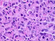 | Pleomorphic | Classical-appearing but with pleomorphic cells. It may include signet-ring cells, or plasmacytoid cells (pictured) which have abundant cytoplasm and eccentric nuclei. | ![]() |