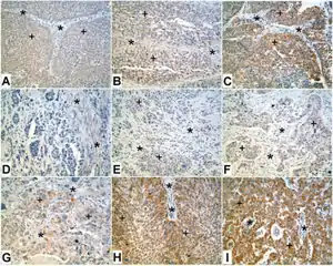| Immunoperoxidase staining of ZIP8 in high grade urothelial carcinoma.A &B. Noninvasive urothelial carcinoma showing weak staining of ZIP8 (+). Asterisks (*) indicate stromal tissue which is negative for ZIP8. C. Noninvasive urothelial carcinoma with focal moderate staining of ZIP8 (+). Asterisks (*) indicate stromal tissue which is negative for ZIP8. D. Invasive urothelial carcinoma with negative staining of ZIP8 (−). Few smooth muscle fibers between the invasive tumor nests are weakly positive for ZIP8 (*). E. Invasive urothelial carcinoma with focal weak staining of ZIP8 (+). Asterisks (*) indicate stromal tissue which is negative for ZIP8. F. Invasive urothelial carcinoma with weak staining of ZIP8 (+). A few spindled shaped stromal cells are also weakly positive for ZIP8 (*). G. Anaplastic urothelial carcinoma showing moderate staining for ZIP8 (+). Asterisks (*) indicate stromal tissue which is negative for ZIP8. H. Invasive urothelial carcinoma with moderate to strong staining of ZIP8 (*). A few spindled shaped stromal cells are weakly positive for ZIP8 (*). I. Poorly differentiated urothelial carcinoma with strong staining for ZIP8 (+). Asterisks (*) indicate stromal tissue which is negative for ZIP8. | |