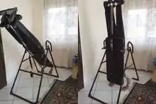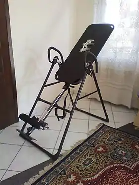 Inversion therapy, or simply inversion, is the process of seeking therapeutic benefits from hanging by the legs, ankles, or feet in an inverted angle or entirely upside down. It is a form of spinal traction.[1] Gravity boots are ankle supports designed for inversion therapy.[2] Some people use gravity boots to add an extra challenge to workouts, doing inverted crunches or squats.[3] Inversion poses of yoga also has some benefits.