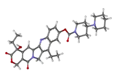 Irinotecan is metabolized by intrahepatic cytochrome P450 enzymes, CYP3A4 and CYP3A5 into inactive metabolites APC (7-ethyl-10-[4-N-(5-aminopentanoic acid)-1-piperidino] carbonyloxycamptothecin) and NPC (7-ethyl-10-[4-amino-1-piperidino] carbonyloxycamptothecin). NPC can be further converted by CES1 and CES2 in the liver to SN-38.[18][19] Induction or inhibition of CYP3A enzymes by smoking, some herbs and medications may result in interactions with irinotecan.[18]