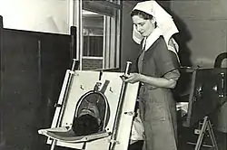 Rows of iron lungs filled hospital wards at the height of the polio outbreaks of the 1940s and 1950s, helping children, and some adults, with bulbar polio and bulbospinal polio. A polio patient with a paralyzed diaphragm would typically spend two weeks inside an iron lung while recovering.[38][39]