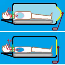 To cause the patient to inhale, air is pumped out of the cylinder, causing a slight vacuum, which causes the patient's chest and abdomen to expand (drawing air from outside the cylinder, through the patient's exposed nose or mouth, into their lungs). Then, for the patient to exhale, the air inside the cylinder is compressed slightly (or allowed to equalize to ambient room pressure), causing the patient's chest and abdomen to partially collapse, forcing air out of the lungs, as the patient exhales the breath through their exposed mouth and nose, outside the cylinder.[1][2][3][11][12]